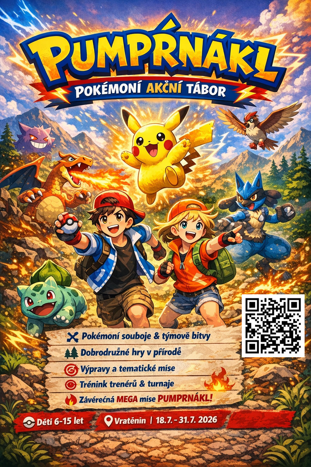 Milé děti a rodiče, zveme vás na jedinečný letní dětský tábor inspirovaný Pokémony! Připravte se na týden plný dobrodružství, napětí a vzrušujících úkolů, které prověří vaši odvahu, důvtip i týmového ducha.